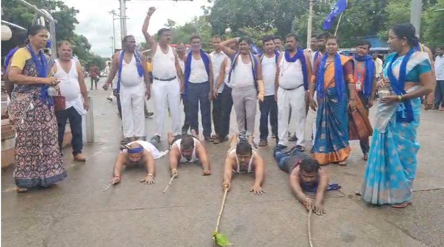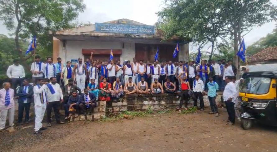 ನಗರದ ಸಂಗೊಳ್ಳಿ ರಾಯಣ್ಣ ವೃತ್ತದಿಂದ ತಹಸಿಲ್ದಾರ ಕಚೇರಿವರೆಗೆ ಅರೆಬೆತ್ತಲೆ ಮೆರವಣಿಗೆ ಮಾಡಿ ಬಸವೇಶ್ವರ ವೃತ್ತದಲ್ಲಿ ಮಾನವ ಸರಪಳಿ ನಿರ್ಮಿಸಿ ಭಾರಿ ಪ್ರತಿಬಟನೆ ಮಾಡಿದರು.