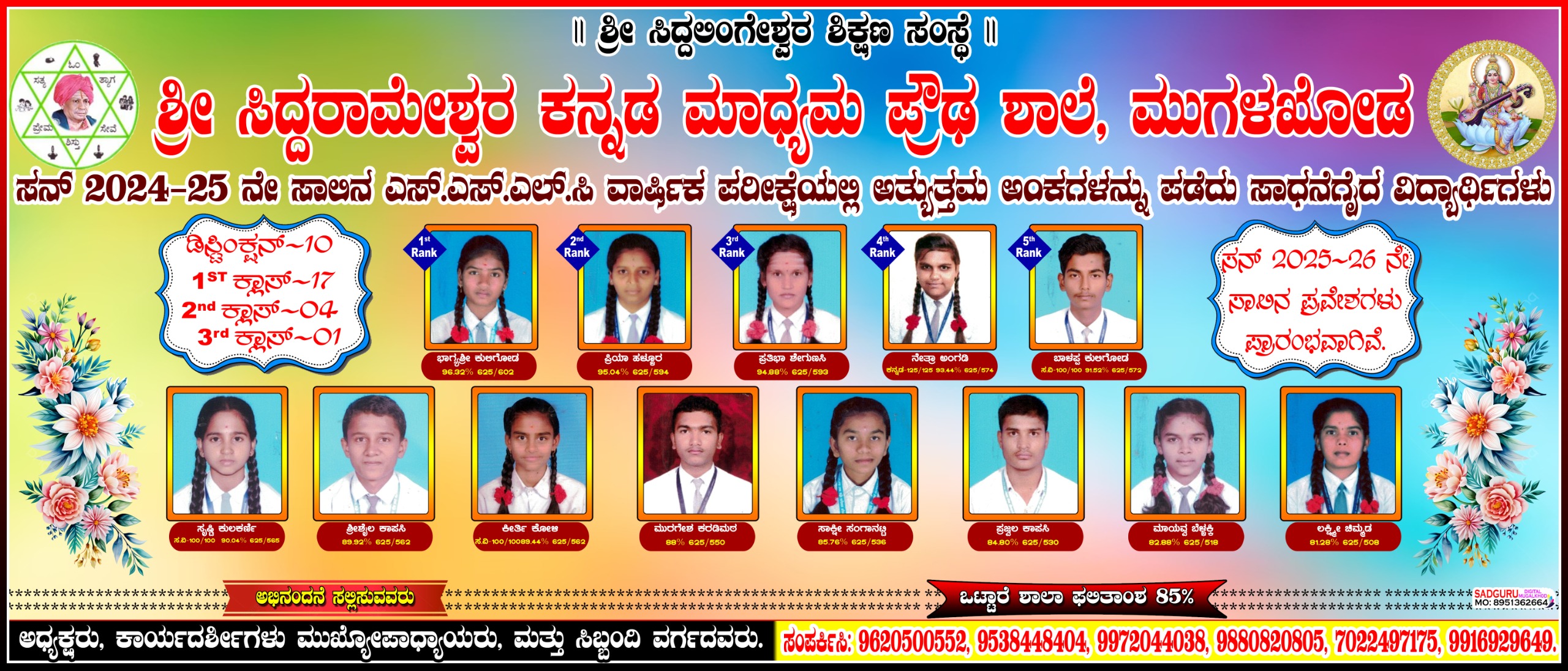 ರಾಯಬಾಗ :ತಾಲೂಕಿನ ಮುಗಳಖೋಡ ಪಟ್ಟಣದ ಶ್ರೀ ಸಿದ್ದಲಿಂಗೇಶ್ವರ ಶಿಕ್ಷಣ ಸಂಸ್ಥೆಯ ಶ್ರೀ ಸಿದ್ದರಾಮೇಶ್ವರ ಪ್ರೌಡಶಾಲೆಯ ವಿದ್ಯಾರ್ಥಿನಿ ಕುಮಾರಿ ಭಾಗ್ಯಶ್ರೀ ಕುಲಿಗೋಡ ಪ್ರತಿಶತ 96.32% ಹಾಗೂ ಪ್ರಿಯಾ ಹಳ್ಳೂರ 95.04% ಮತ್ತು ಪ್ರತಿಭಾ ಶೇಗುಣಸಿ 94.88% ಅಂಕಗಳನ್ನು ಗಳಿಸುವ ಮೂಲಕ ಹಾಗೂ ಸಮಾಜ ವಿಜ್ಞಾನದಲ್ಲಿ ಮೂರು ಜನ ವಿದ್ಯಾರ್ಥಿಗಳೂ 100ಕ್ಕೆ 100ಅಂಕಗಳನ್ನು ಗಳಿಸುವ ಮೂಲಕ ನಮ್ಮ ಪ್ರೌಡ ಶಾಲೆಯ ಕೀರ್ತಿಯನ್ನು ಹೆಚ್ಚಿಸಿದ್ದಾರೆ.