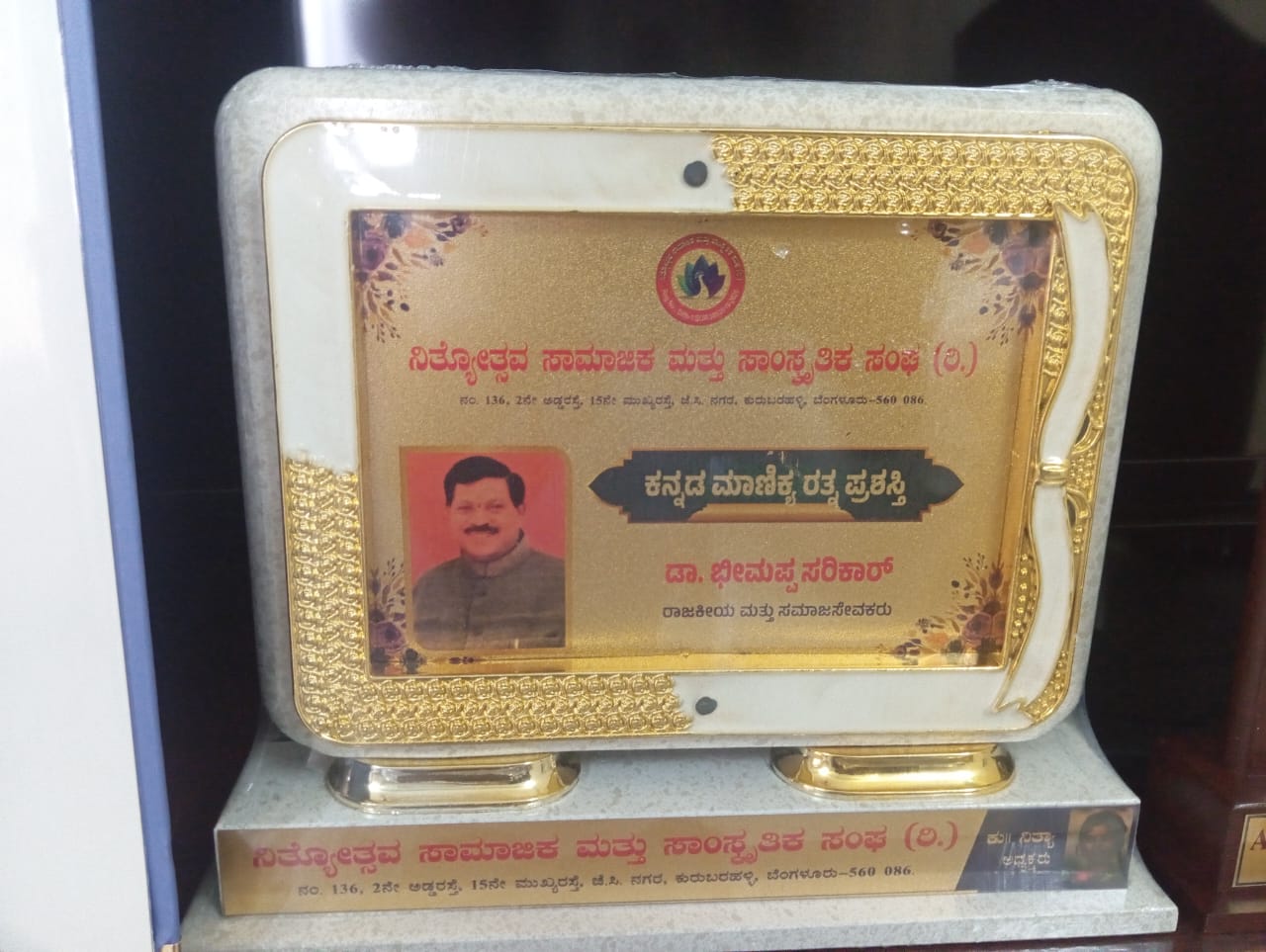 ಬೆಳಗಾವಿ: ಜಿಲ್ಲೆಯ ರಾಯಬಾಗ ತಾಲೂಕಿನ ಹಾರೂಗೇರಿ ಪಟ್ಟಣದ ಭೀಮಪ್ಪ ಚನ್ನಪ್ಪ ಸರಿಕರ್ ಮಾಜಿ JDS ನ ಶಾಸಕರು 2004 To 2008 ರ ಅವಧಿಯಲ್ಲಿ ಹಲವಾರು ರಾಜಕೀಯ ಸೇವೆಗಳು ಹಾಗೂ ಸಮಾಜದ ಗುಣಮಟ್ಟದ ಕಾರ್ಯಗಳನ್ನು ಹಾಗೂ ದೀನ ದಲಿತರ ಏಳಿಗೆಗಾಗಿ ತಮ್ಮ ಶಾಸಕರ ಅವಧಿಯಲ್ಲಿ ತಮಗೆದ್ದ ಅಲ್ಪ ಅವಧಿಯಲ್ಲಿ ರಾಯಬಾಗ ತಾಲೂಕಿನ ಆಡಳಿತ ಸೌಧ ಹಾಗೂ ಹಲವಾರು ಮಠ ಮಂದಿರಗಳಿಗಾಗಿ ಅವತ್ತಿನ ಮುಖ್ಯಮಂತ್ರಿ ಎಚ್ ಡಿ ಕುಮಾರಸ್ವಾಮಿ ಅವರು ಜೊತೆ ಒಡನಾಟದಲ್ಲಿದ್ದು ರಾಯಬಾಗ್ ಮತಕ್ಷೇತ್ರಕ್ಕೆ ಸಾಕಷ್ಟು ಅನುದಾನಗಳನ್ನು ತಂದು ತನ್ನ ಕ್ಷೇತ್ರದ ಅಭಿವೃದ್ಧಿಗಾಗಿ ಶ್ರಮಪಟ್ಟರು ಈ ಗಮನಾರ್ ಸೇವೆಯನ್ನು ಮನದಲ್ಲಿಟ್ಟುಕೊಂಡು ಅವರಿಗೆ ತಮಿಳುನಾಡಿನ ಏಷ್ಯಾ ಇಂಟರ್ನ್ಯಾಷನಲ್ ಕಲ್ಚರ್ ರಿಸರ್ಚ್ ಇನ್ವರ್ಸಿಟಿ ಅವರು ಭೀಮಪ್ಪ ಚನ್ನಪ್ಪ ಸರಿಕರ್ ಇವರಿಗೆ ಗೌರವ ಡಾಕ್ಟರೇಟ್ ಪದವಿಯನ್ನು ನೀಡಿ ಹಾಗು ಕನ್ನಡ ಮಾಣಿಕ್ಯ ರತ್ನ ಪ್ರಶಸ್ತಿ ನೀಡಿ ಗೌರವಿಸಿದ್ದಾರೆ.