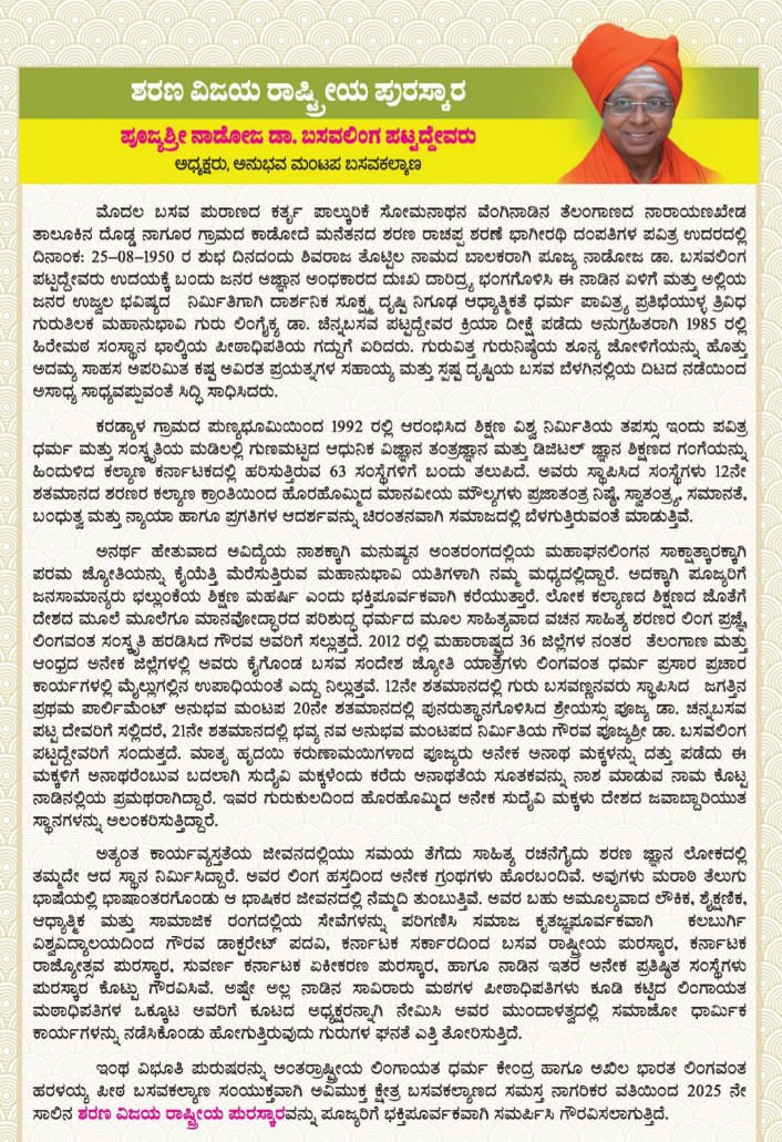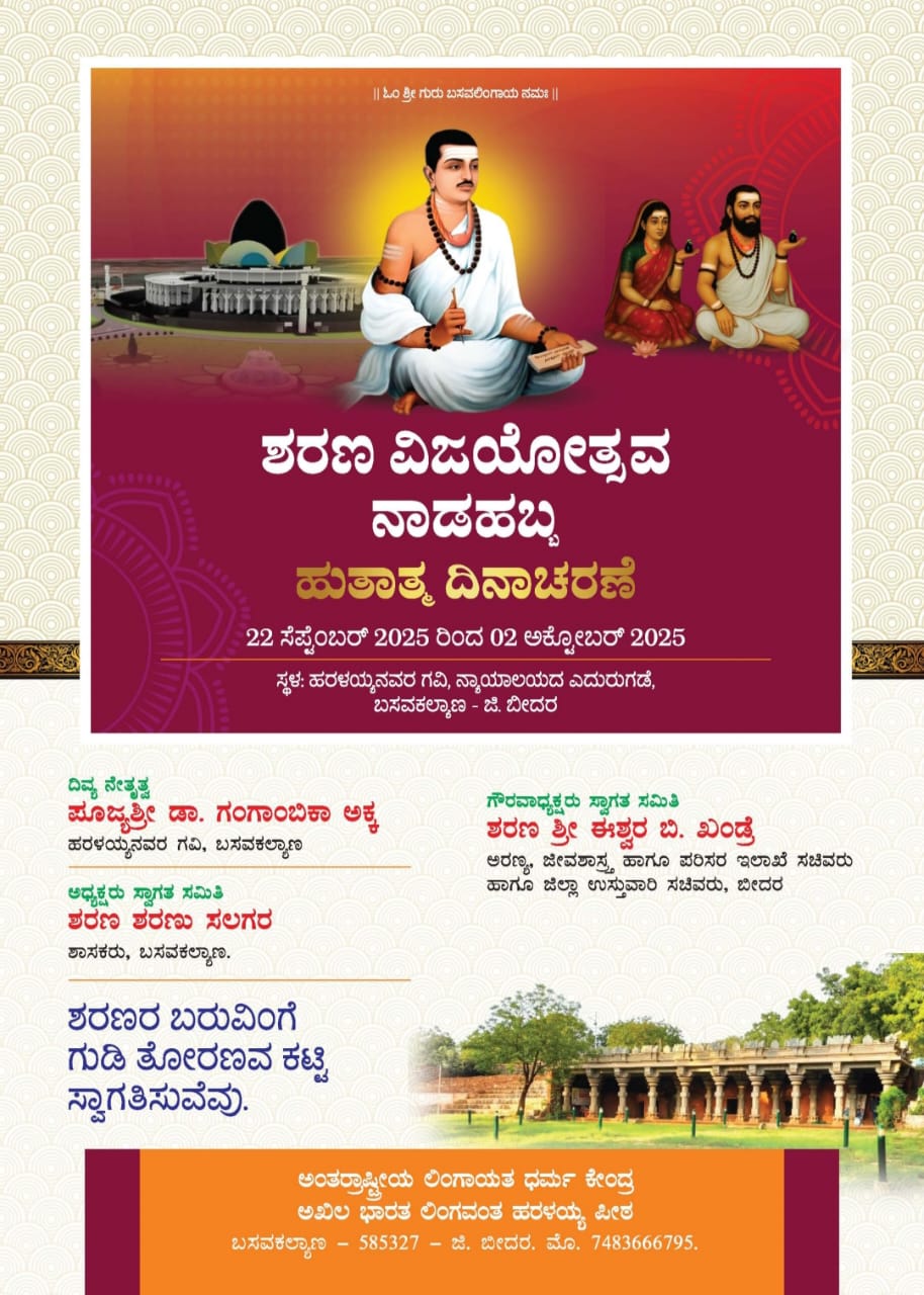 ಕೊನೆಯದಾಗಿ – ಈ ಶರಣ ವಿಜಯೋತ್ಸವ ಸಮಾರಂಭಕ್ಕೆ ಜಾತಿ ಮತ ಪಂಥಗಳ ಭೇದವಿಲ್ಲದೆ, ಸರ್ವರಿಗೂ ಆದರದ ಸ್ವಾಗತವಿದೆ.