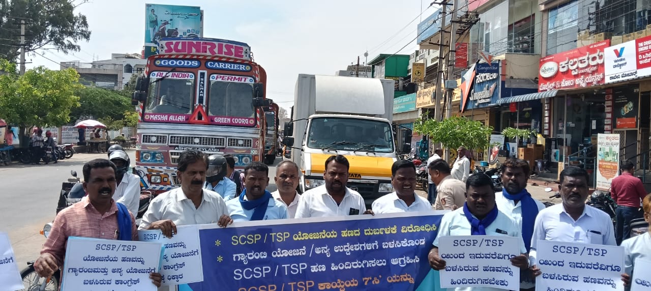 ಚಾಮರಾಜನಗರ: SCSP/TSP ಯೋಜನೆಯ ಹಣವನ್ನು ಗ್ಯಾರಂಟಿ ಯೋಜನೆಗಳಿಗೆ ಹಾಗೂ ಇತರೆ ಯೋಜನೆಗಳಿಗೆ ಬಳಸಿಕೊಂಡಿರುವುದನ್ನು ಖಂಡಿಸಿ ಹಣವನ್ನು ವಾಪಸ್ ತುಂಬುವಂತೆ ಅಗ್ರಹಿಸಿ ಪಟ್ಟಣದ ಭುವನೇಶ್ವರಿ ವೃತ್ತದಲ್ಲಿ ರಸ್ತೆ ತಡೆಮಾಡಿ ದಲಿತ ಸಂಘರ್ಷ ಸಮಿತಿ ವತಿಯಿಂದ ಪ್ರತಿಭಟನೆ ನೆಡೆಸಲಾಯಿತು.
