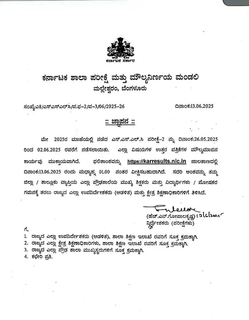 ಎಸದ ಎಸ್ ಎಲ್ ಸಿ ಪರೀಕ್ಷೆ -1 ರ ಫಲಿತಾಂಶವನ್ನು ದಿನಾಂಕ 2 ಮೇ 2025 ರಂದು ಬಿಡುಗಡೆ ಮಾಡಲಾಯಿತು .