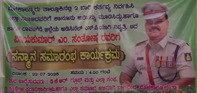 ಚಿತ್ರಶೀರ್ಷಿಕೆ22ಎಂಎಲ್ ಕೆ1ಮೊಳಕಾಲ್ಮುರು ಪಟ್ಟಣದ ಸಾಮರ್ಥ್ಯ ಸೌಧದಲ್ಲಿ ತಾಲೂಕಿನಲ್ಲಿ ವೃತ್ತ ಪೋಲಿಸ್ ನಿರೀಕ್ಷಕರಾಗಿ ಸೇವೆ ಸಲ್ಲಿಸಿ ಬಡ್ತಿ ಪಡೆದು ಅಡಿಶಿನಲ್ ಎಸ್ ಪಿ ಯಾಗಿ ನಿವೃತ್ತರಾದ ವಿಜಯ ಕುಮಾರ್ ಎಂ.ಸಂತೋಷ್ ಅವರ ಬೀಳ್ಕೊಡುಗೆ ಸಮಾರಂಭವನ್ನು ವಿಜಯ ಕುಮಾರ್ ಎಂ.ಸಂತೋಷ್ ಉದ್ಘಾಟಿಸಿದರು.
