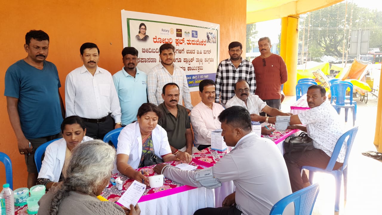 ತುರುವೇಕೆರೆ : ಪಟ್ಟಣದ ವಾಣಿಜ್ಯ ಸಂಕೀರ್ಣದ ಬಳಿ ರೋಟರಿ ಕ್ಲಬ್ ವತಿಯಿಂದ ಬೀದಿಬದಿ ವ್ಯಾಪಾರಸ್ಥರಿಗೆ, ನಾಗರೀಕರಿಗೆ ಉಚಿತ ರಕ್ತದೊತ್ತಡ, ಮಧುಮೇಹ ತಪಾಸಣಾ ಶಿಬಿರವನ್ನು ಹಮ್ಮಿಕೊಳ್ಳಲಾಗಿತ್ತು.