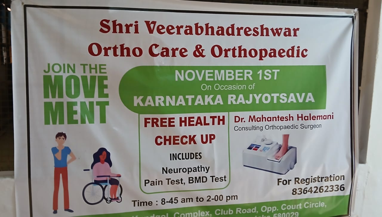 ಹುಬ್ಬಳ್ಳಿ: ವಾಣಿಜ್ಯ ನಗರ ಹುಬ್ಬಳ್ಳಿಯಲ್ಲಿ 69ನೇ ಕರ್ನಾಟಕ ರಾಜ್ಯೋತ್ಸವ ಅಂಗವಾಗಿ ಹುಬ್ಬಳ್ಳಿಯ ಖ್ಯಾತ ಎಲಬು ಕೀಲು ತಜ್ಞರಾದಂತಹ ಡಾಕ್ಟರ್ ಮಹಾಂತೇಶ್ ಹಳೆಮಣಿ ಹಾಗೂ ಅವರ ಧರ್ಮಪತ್ನಿ ಸ್ತ್ರೀ ಪ್ರಸುತಿ ವೈದ್ಯರಾದಂತಹ ಡಾಕ್ಟರ್ ಸುಧಾ ಮಹಾಂತೇಶ್ ಹಳಮಣಿ ಇವರ ಸಯೋಗದಲ್ಲಿ ಹುಬ್ಬಳ್ಳಿಯ ಹಳೇ ಕೋರ್ಟ್ ಎದುರುಗಡೆ ಇರುವ ಕುಂದಗೋಳ ಕಾಂಪ್ಲೆಕ್ಸ್ ನಲ್ಲಿ ತಮ್ಮದೇ ಕ್ಲಿನಿಕ್ ನಲ್ಲಿ ಉಚಿತ ಆರೋಗ್ಯ ತಪಾಸಣಾ ಶಿಬಿರವನ್ನು ಹಮ್ಮಿಕೊಂಡಿದ್ದರು.