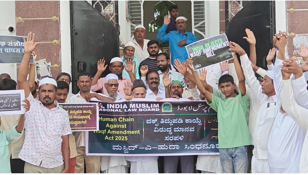 ಸಿಂಧನೂರು : ಜುಲೈ 4ರಂದು ನಗರದ ಮಜೀದ್ ಏ ಹುದಾ ಪಟೇಲ್ ವಾಡಿ ರಸ್ತೆ ಮುಂಭಾಗದಲ್ಲಿ ಶುಕ್ರವಾರ ಮಾನವ ಸರಪಳಿ ನಿರ್ಮಿಸಿ ಪ್ರತಿಭಟಿನೆ ನಡೆಸಿ ವಕ್ಫ್ ತಿದ್ದುಪಡಿ ಕಾಯ್ದೆ 2025 ವಾಪಾಸ್ ಪಡೆಯಲು ನಗರದ ಹಳೆಯ ಬಜಾರದವರಿಗೆ ಸುಮಾರು ಸಾವಿರಕ್ಕೂ ಹೆಚ್ಚು ಜನರು ಭಾಗವಹಿಸಿ ವಕ್ಫಾ ತಿದ್ದುಪಡಿ ಕಾಯ್ದೆ ಅಸಂವಿಧಾನಿಕ ರದ್ದುಗೊಳಿಸಿ. ಭರವಸೆ ಅಲ್ಲ ನಿರಾಸೆ ರದ್ದುಗೊಳಿಸಿ ಎನ್ನುವ ಬಿತ್ತಿ ಪತ್ರಗಳನ್ನು ಹಿಡಿದುಕೊಂಡು ಪ್ರತಿಭಟಿಸಿದರು.