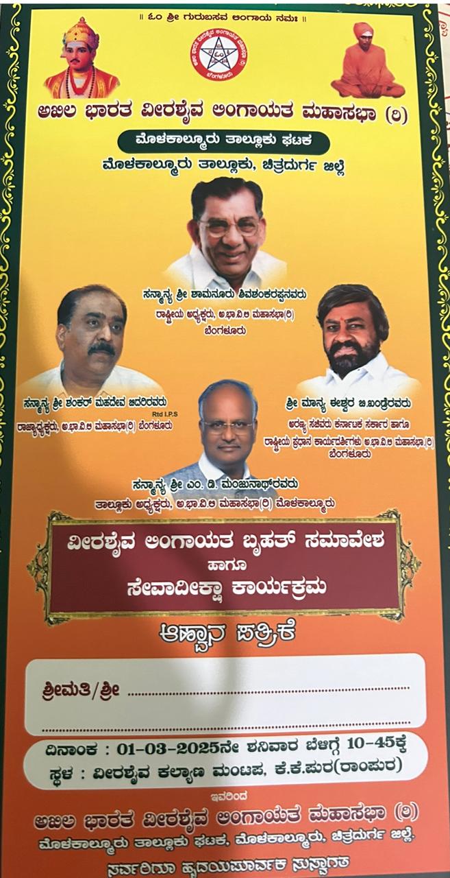 ಮೊಳಕಾಲ್ಮೂರು :ಶನಿವಾರ ನಡೆಯುವ ವೀರಶೈವ ಲಿಂಗಾಯಿತ ಬೃಹತ್ ಸಮಾವೇಶ ಹಾಗೂ ಸೇವಾ ದೀಕ್ಷಾ ಕಾರ್ಯಕ್ರಮವನ್ನು ಯಶಸ್ವಿಗೊಳಿಸಬೇಕು ಎಂ ಡಿ ಮಂಜುನಾಥ್