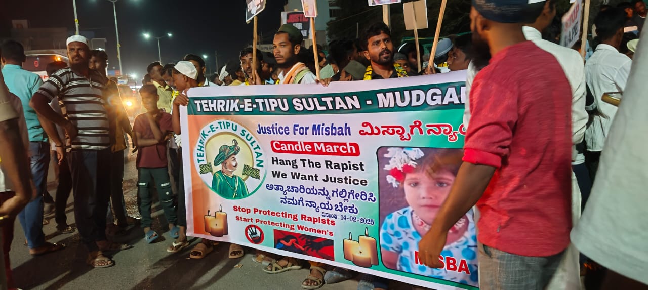 ಮುದಗಲ್ಲ : ಮಹಾರಾಷ್ಟ್ರದ ಸಾಂಗಲಿ ಜಿಲ್ಲೆಯ ಕರಜಗಿ ಗ್ರಾಮದಲ್ಲಿ ನಾಲ್ಕು ವರ್ಷದ ಬಾಲಕಿ ಮೇಲೆ ನಡೆದ ಅತ್ಯಾಚಾರ ಮತ್ತು ಕೊಲೆಯನ್ನು ಖಂಡಿಸಿ ತೆಹ್ರಿಕ-ಇ-ಟಿಪ್ಪು ಸುಲ್ತಾನ್ ಸಂಘಟನೆ ವತಿಯಿಂದ ಮೇಣದ ಬತ್ತಿಯ ಮೆರವಣಿಗೆ ಮಾಡಲಾಯಿತು ಪೊಲೀಸ್ ಠಾಣೆಯ ಮುಂಭಾಗದಲ್ಲಿ ದಲ್ಲಿ ಅಂಬೇಡ್ಕರ್ ವೃತ್ತಿಯಲ್ಲಿ ಮೇಣದ ಬತ್ತಿ ಹಚ್ಚಿ ನಾಲ್ಕು ವರ್ಷದ ಬಾಲಕಿ ಮಿಸ್ಬಾಗೆ ಅವರ ಆತ್ಮಕ್ಕೆ ಶಾಂತಿ ನೀಡಲಿ ಹಾಗೂ ಅತ್ಯಾಚಾರಿಯನ್ನು ಗಲ್ಲು ಶಿಕ್ಷೆ ವಿಧಿಸಿ ನಮಗೆ ನ್ಯಾಯ ಬೇಕು ಎಂದು ಪ್ರತಿಭಟನೆ ನಡೆಯಿತು.