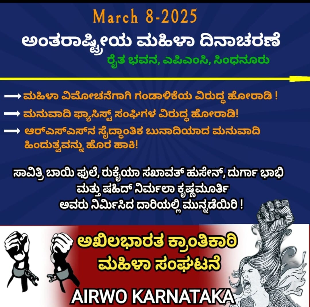 ಸಿಂಧನೂರು : ಮಾರ್ಚ್ 8 ರಂದು ಅಂತರಾಷ್ಟ್ರೀಯ ಮಹಿಳಾ ದಿನವೂ ತಮ್ಮ ಹಕ್ಕುಗಳನ್ನು ಸಾಧಿಸಲು ಮಹಿಳೆಯರು ಸುಧೀರ್ಘ ಹೋರಾಟಗಳ ಭವ್ಯವಾದ ಇತಿಹಾಸ ವನ್ನು ಸ್ಮರಿಸಲು ಮತ್ತು ಮಹಿಳೆಯರನ್ನು ಸಂಘಟಿಸಲು ಅವರ ಹಕ್ಕಿಗಳಿಗಾಗಿ ಹೋರಾಡಿ ತಮ್ಮ ಪ್ರಾಣ ತ್ಯಾಗ ಮಾಡಿದ ಹುತಾತ್ಮರಿಗೆ ಗೌರವ ಸಲ್ಲಿಸಲು ಇಡೀ ಜಗತ್ತು 8 ನೇ ಮಾರ್ಚ್ 2025 ರಂದು ಎಲ್ಲಾ ಮಹಿಳೆಯರು ಮತ್ತು ಯುವತಿರಿಗಾಗಿ ಹಕ್ಕುಗಳು ಸಮಾನತೆ ಸಬಲೀಕರಣ ಎಂಬ ವಿಷಯದ ಅಡಿಯಲ್ಲಿ ಮಹಿಳಾ ದಿನಾಚರಣೆಯನ್ನು ಅಂಗವಾಗಿ ಸಿಂಧನೂರು ನಗರದ ಎಪಿಎಂಸಿ ರೈತ ಭವನದಲ್ಲಿ ಆಚರಿಸಲು ಅಖಿಲ ಭಾರತ ಕ್ರಾಂತಿಕಾರಿ ಮಹಿಳಾ ಸಂಘಟನೆ ಎಐಆರ್ಡಬ್ಲ್ಯೂಓ ಸಂಘಟನೆ ಕರೆ ನೀಡಿದೆ.