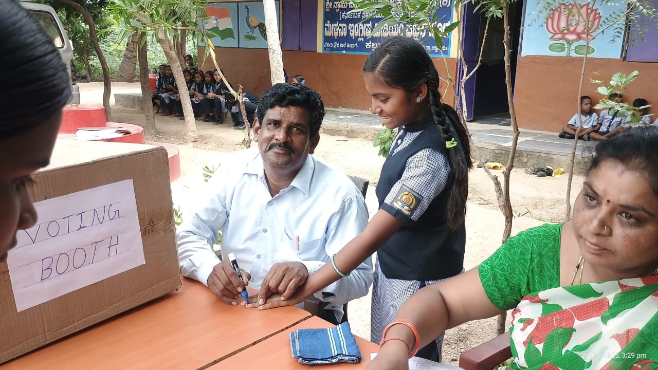 ಶಾಲೆಯ ಐದರಿಂದ ಎಂಟನೇ ತರಗತಿಯ ವಿದ್ಯಾರ್ಥಿ, ವಿದ್ಯಾರ್ಥಿನಿಯರು ಸಾಲುಗಟ್ಟಿ ನಿಂತು, ಆಧಾರ್ ಕಾರ್ಡ್ ತೋರಿಸಿ, ಸಹಿ ಮಾಡಿ, ಬ್ಯಾಲೆಟ್ ಪೇಪರ್ ಪಡೆದು ಮತದಾನ ಮಾಡುವ ಮೂಲಕ ನಮ್ಮ ಪ್ರತಿನಿಧಿಗಳನ್ನು ಆಯ್ಕೆ ಮಾಡಿದರು.