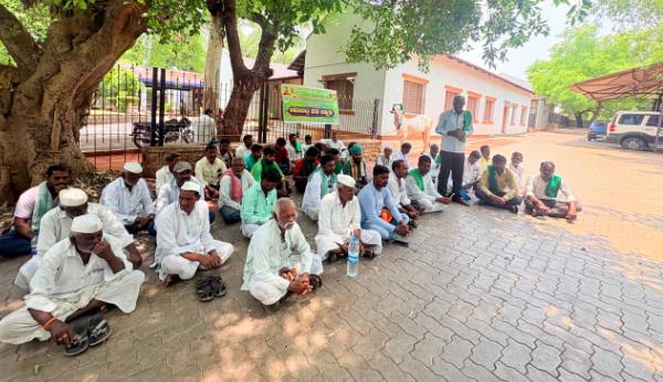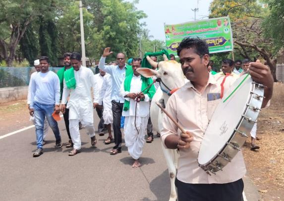 ರಾಮಲಿಂಗೇಶ್ವರ ಮಂದಿರದಿಂದ ತಮಟೆ ಹಲಿಗೆಯನ್ನು ಬಾರಿಸುತ್ತಾ ಜನ ಹಾಗೂ ಜಾನುವಾರುಗಳಲ್ಲಿ ಒಂದಾದ ಆಕಳಿನ ಕೋಡಿಗೆ ಹಸಿರು ಶಾಲ್ ಕಟ್ಟಿ ಕೊಂಡು ಅಧಿಕಾರಿಗಳಿಗೆ ಧಿಕ್ಕಾರ ಕೂಗುತ್ತಾ ಕೆ.ಬಿ.ಜೆ.ಎನ್.ಎಲ್ ಮುಖ್ಯ ಅಭಿಯಂತರರ ಕಛೇರಿ ಬಂದ ರೈತರು.