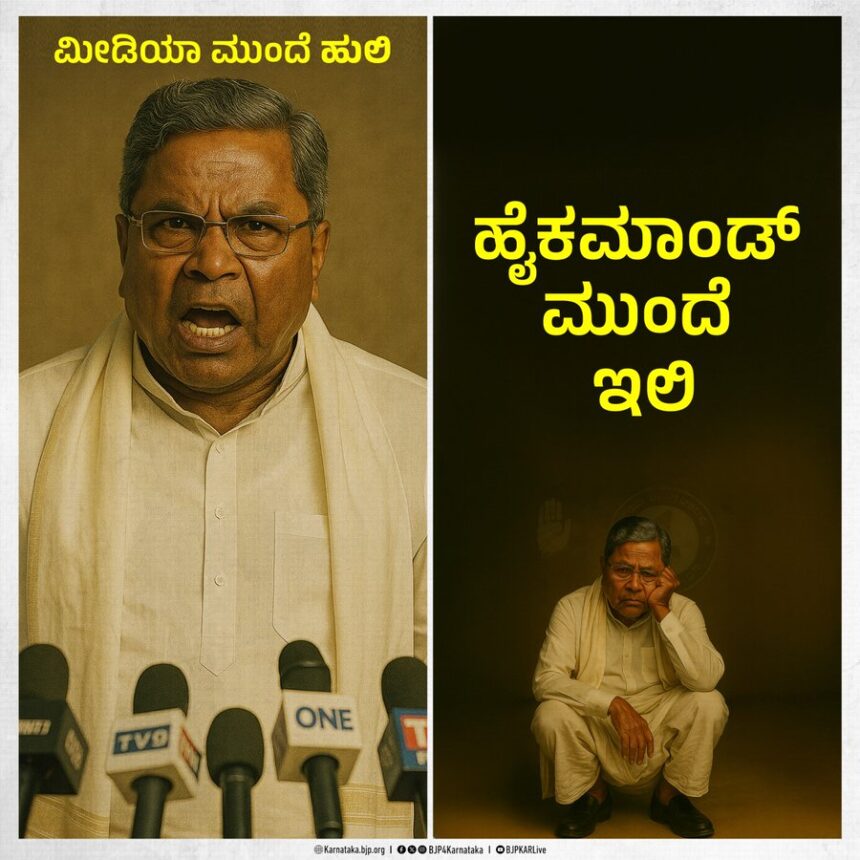 ಈ ಕುರಿತು ಕರ್ನಾಟಕ ಬಿಜೆಪಿ ಪೋಸ್ಟ್ ಮಾಡಿದ್ದು, ಸಿಎಂ ಸಿದ್ದರಾಮಯ್ಯ ಮಿಡಿಯಾ ಮುಂದೆ ಮಾತನಾಡುವ ಫೋಟೊಗೆ ಮಿಡಿಯಾ ಮುಂದೆ ಹುಲಿ ಹಾಗೂ ಕೂತಿರುವ ಫೋಟೊಗೆ ಹೈಕಮಾಂಡ್ ಮುಂದೆ ಇಲಿ ಅಂತ ಶೀರ್ಷಿಕೆ ಹೊಂದಿರುವ ಪೋಸ್ಟರ್ ಶೇರ್ ಮಾಡಿದೆ.