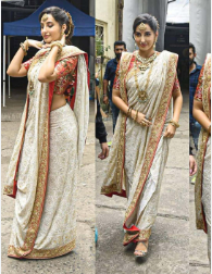ಸೀರೆಗೆ ತಕ್ಕ ಆಭರಣಗಳು, ಮ್ಯಾಚಿಂಗ್​ ಕಿವಿಯೋಲೆಗಳು ಮತ್ತು ರಿಂಗ್ ಅನ್ನು ಧರಿಸೋ ಮೂಲಕ ತಮ್ಮ ಸಾಂಪ್ರದಾಯಿಕ ನೋಟವನ್ನು ಪೂರ್ಣಗೊಳಿಸಿಕೊಂಡಿದ್ದರು. ರಿಚ್​​ ರೆಡ್​​ ಲಿಪ್‌ಸ್ಟಿಕ್, ಡಾರ್ಕ್ ಐಲೈನರ್ ಗಮನ ಸೆಳೆಯುವಂತಿತ್ತು. ತಮ್ಮ ಕೇಶರಾಶಿಯನ್ನು ಸೊಗಸಾಗಿ ಬಿಟ್ಟಿದ್ದರು.